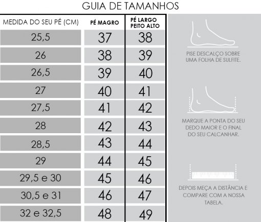 Se ainda estiver em dúvida, recomendamos que você escolha o calçado no tamanho que você costuma comprar, já que as formas dos calçados normalmente seguem o padrão do mercado.